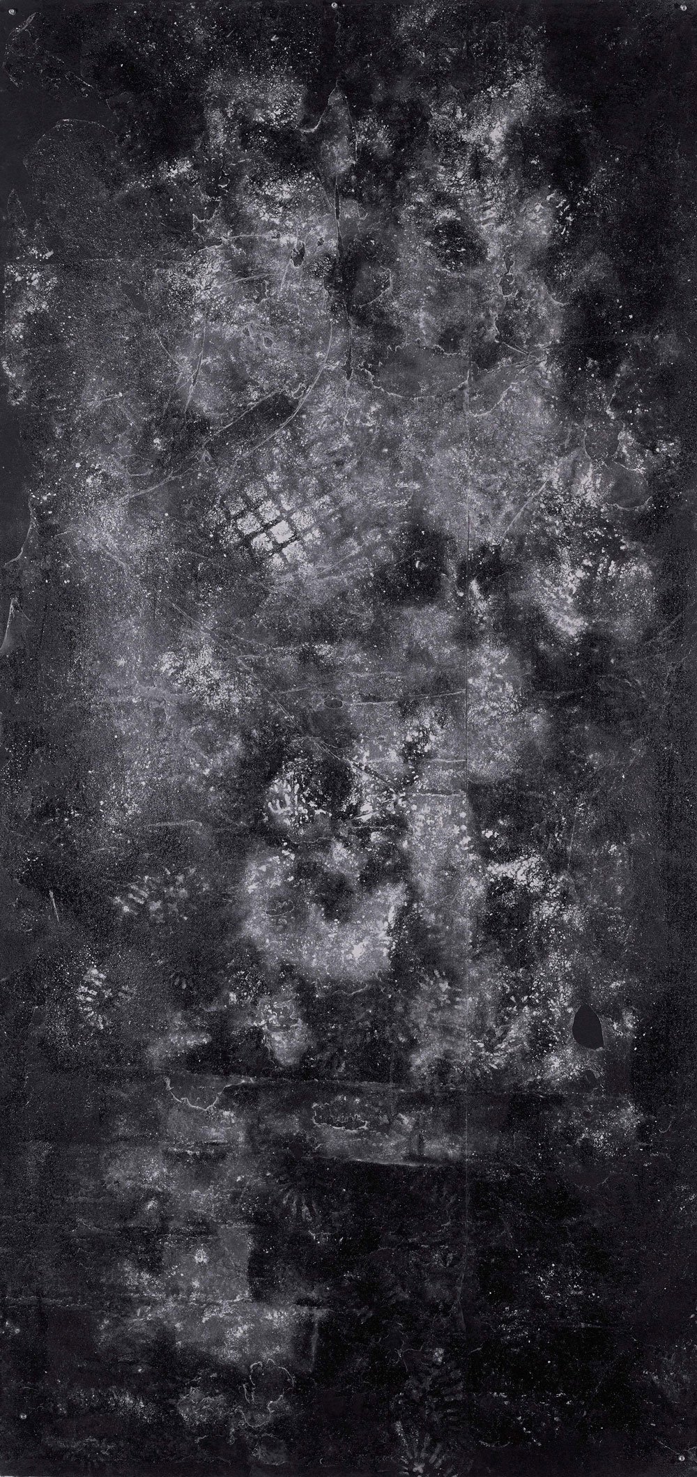 Jeffrey Meris | I, Used To Be (X), 2020 Plaster Particles on Roofing Paper, Double Sided Adhesive Tape, plexi, sintra 79 in x 36 in