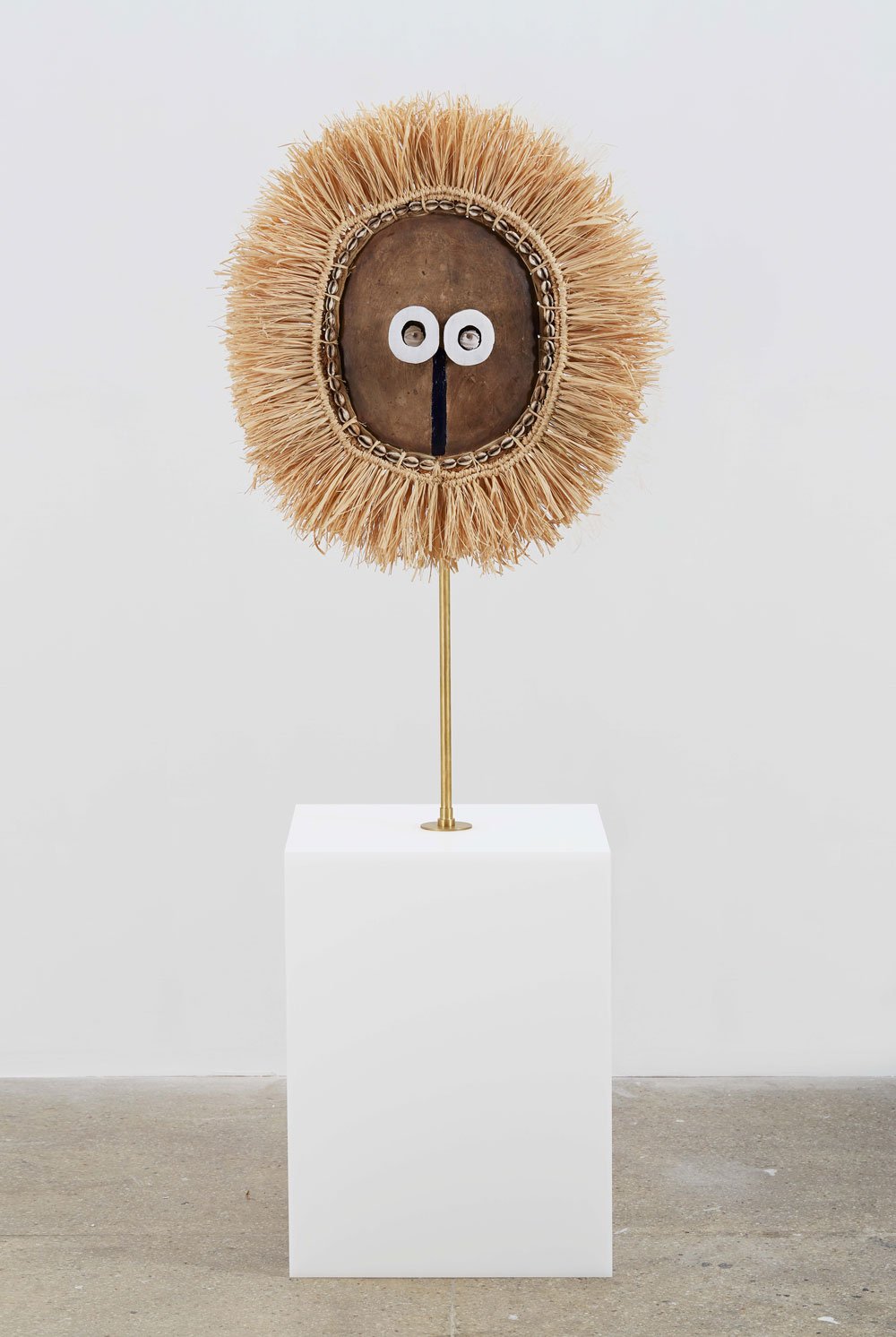 Tavares Strachan | Distant Relatives (W.E.B. Dubois), 2020 Pende Mask (DR Congo), pigment, natural fibers, plaster, brass, acrylic 24 L x 20 in W x 67in H