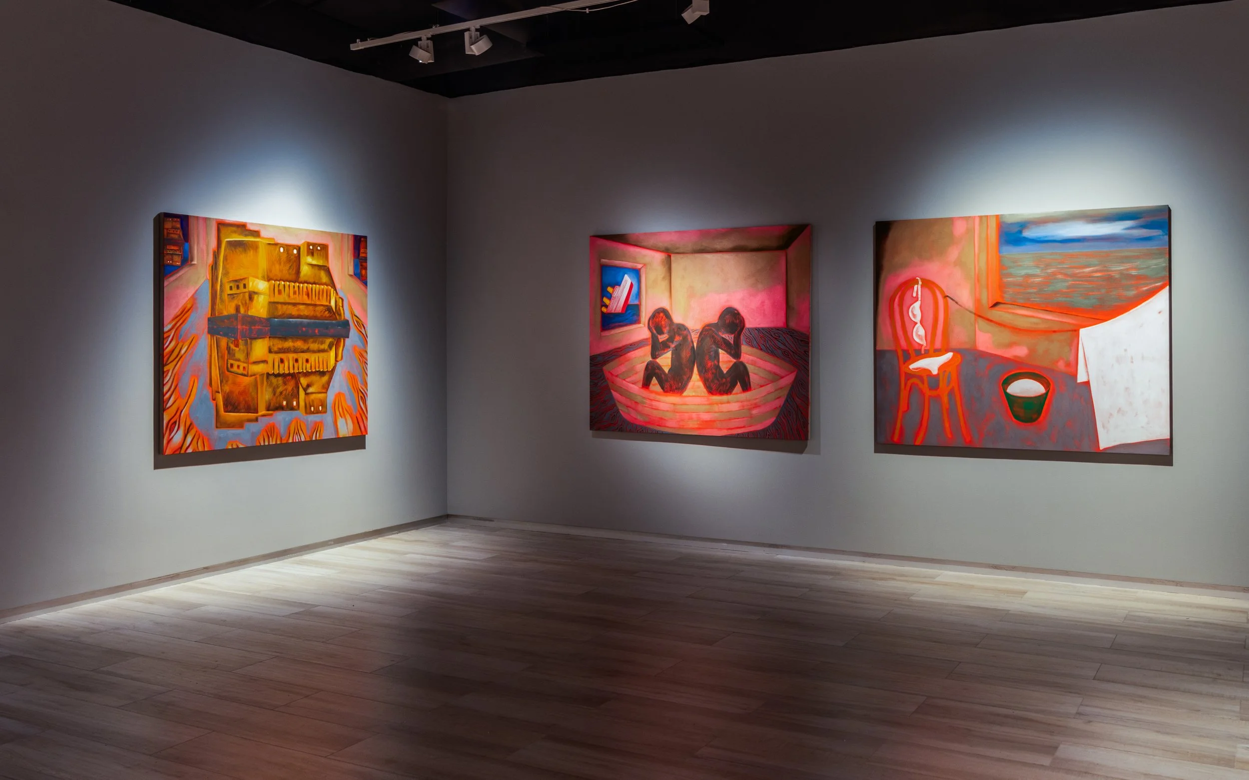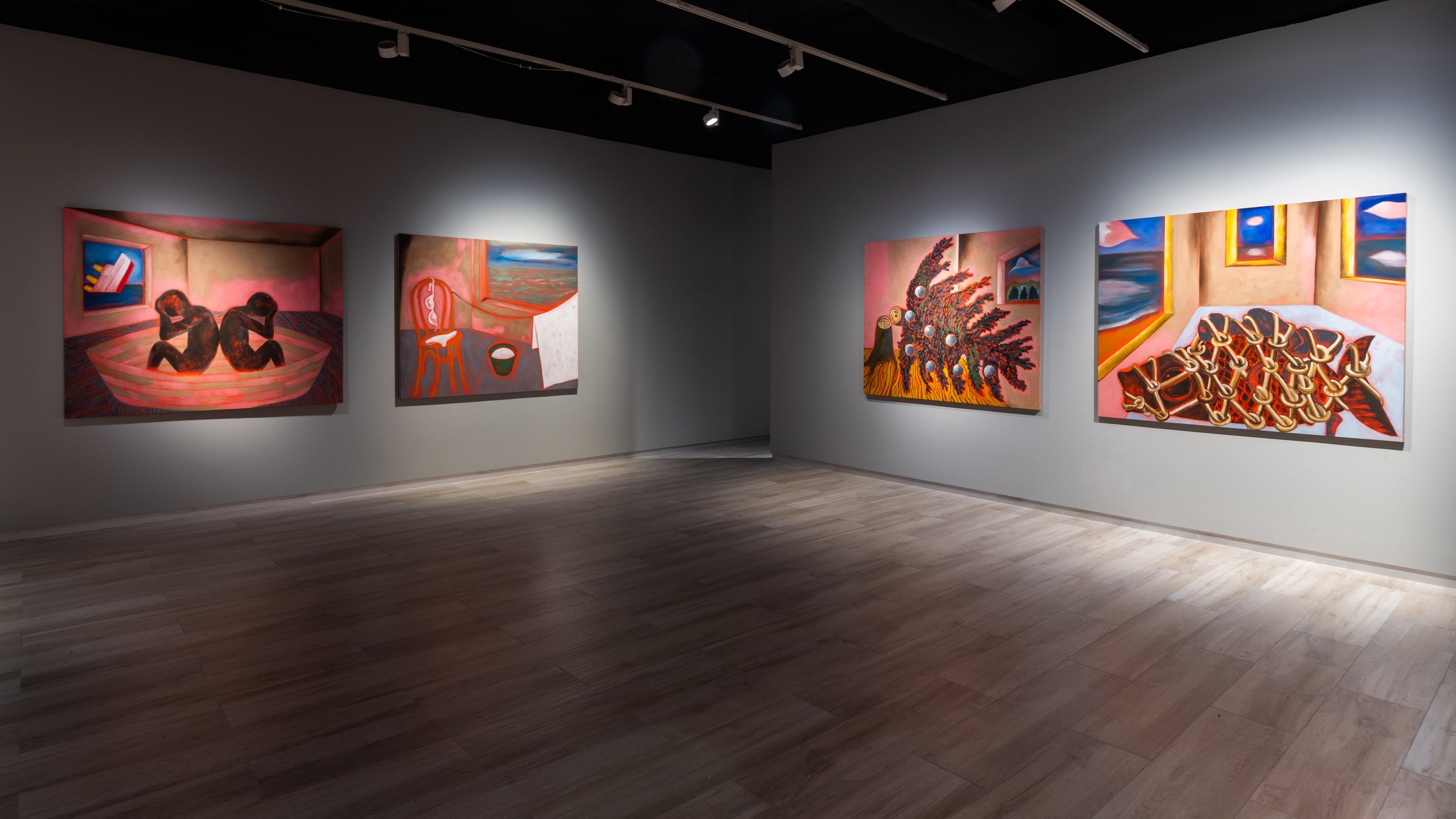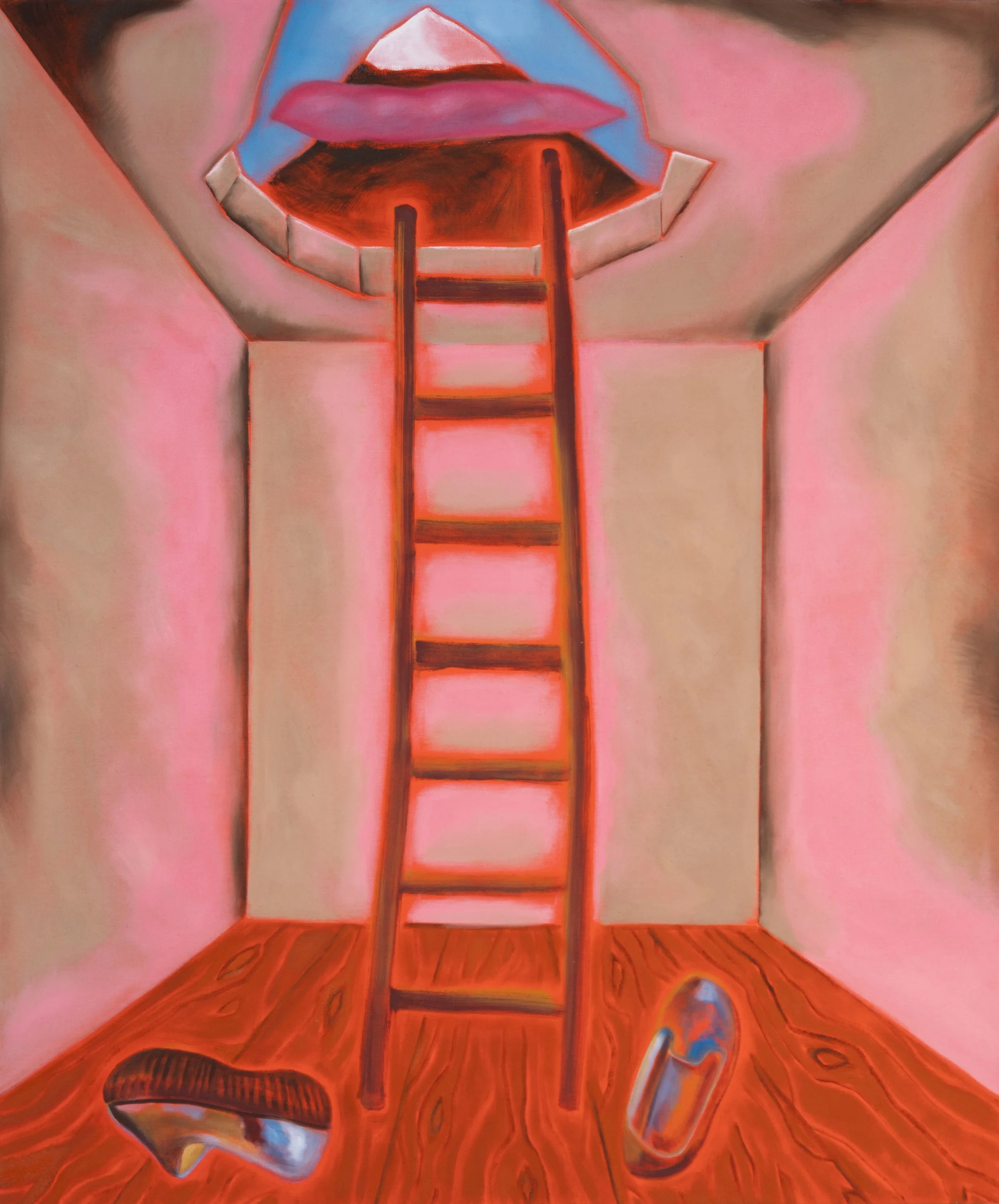 In Windows, we witness incomprehensible events happen in the glowing warmth of rooms-wombs. We glimpse the Sea, the Trees, the Mountain, through symmetrical windows or, in the last painting of the group, through a crack in the ceiling: here, escape can only happen in the verticality of contemplation and timelessness.